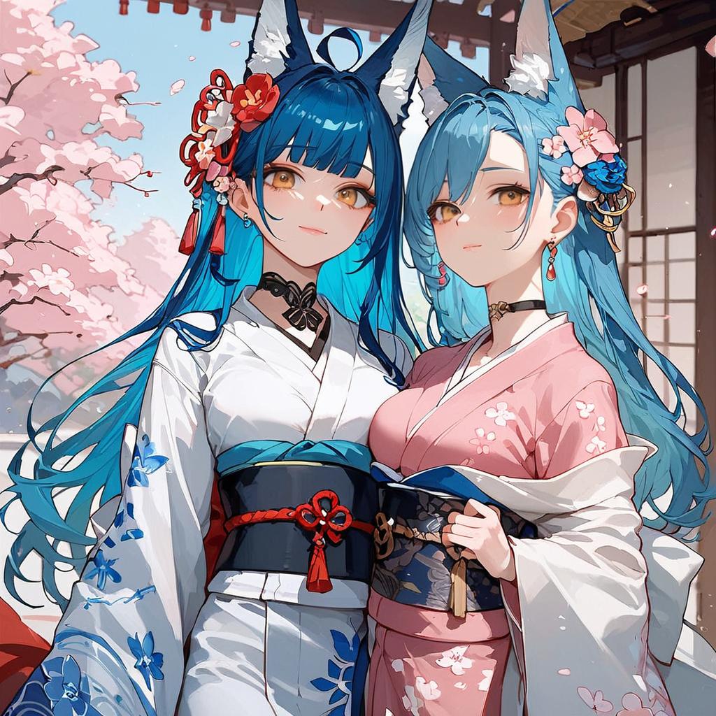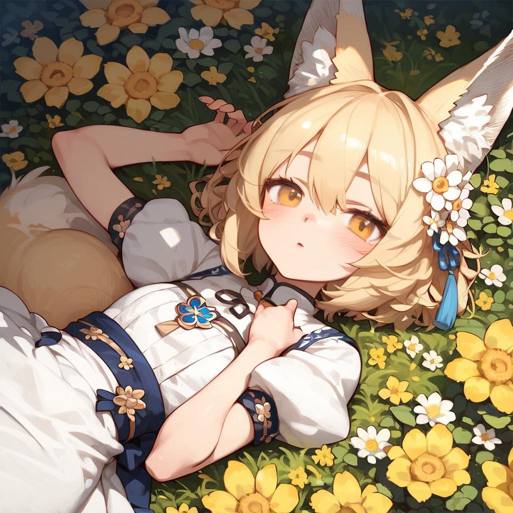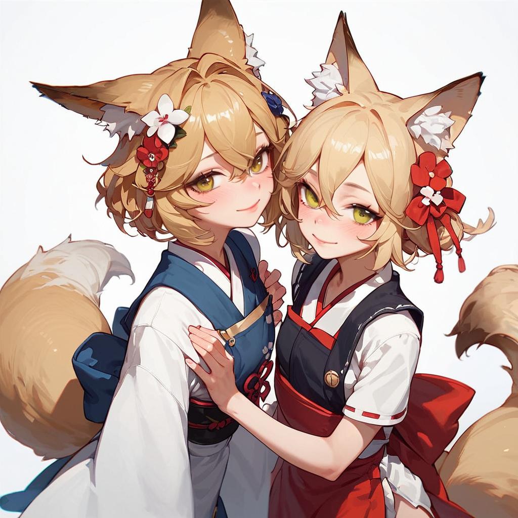 Score9, _score_8_up, score_7_up, score_6_up, best quality, masterpiece, uncensored, source_anime, Y, simple background, white background, sen, blonde hair, animal ears, fox ears, blush, animal ear fluff, hair ornament, fox girl, hair flower, hair between eyes, short hair, fox tail, tail, flat chest, yellow eyes, young girlsmile, standing, miko, apron, japanese clothes, ribbon mesh sleevesX