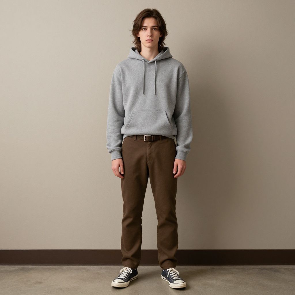Photograph of a young man with wavy brown hair, wearing a light gray hoodie, brown pants, black belt, and black and white sneakers,