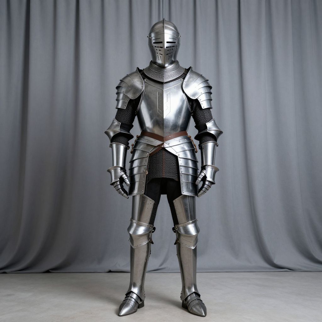 Photograph of a full-armored knight in shiny silver steel plate armor, standing in front of a gray fabric backdrop.