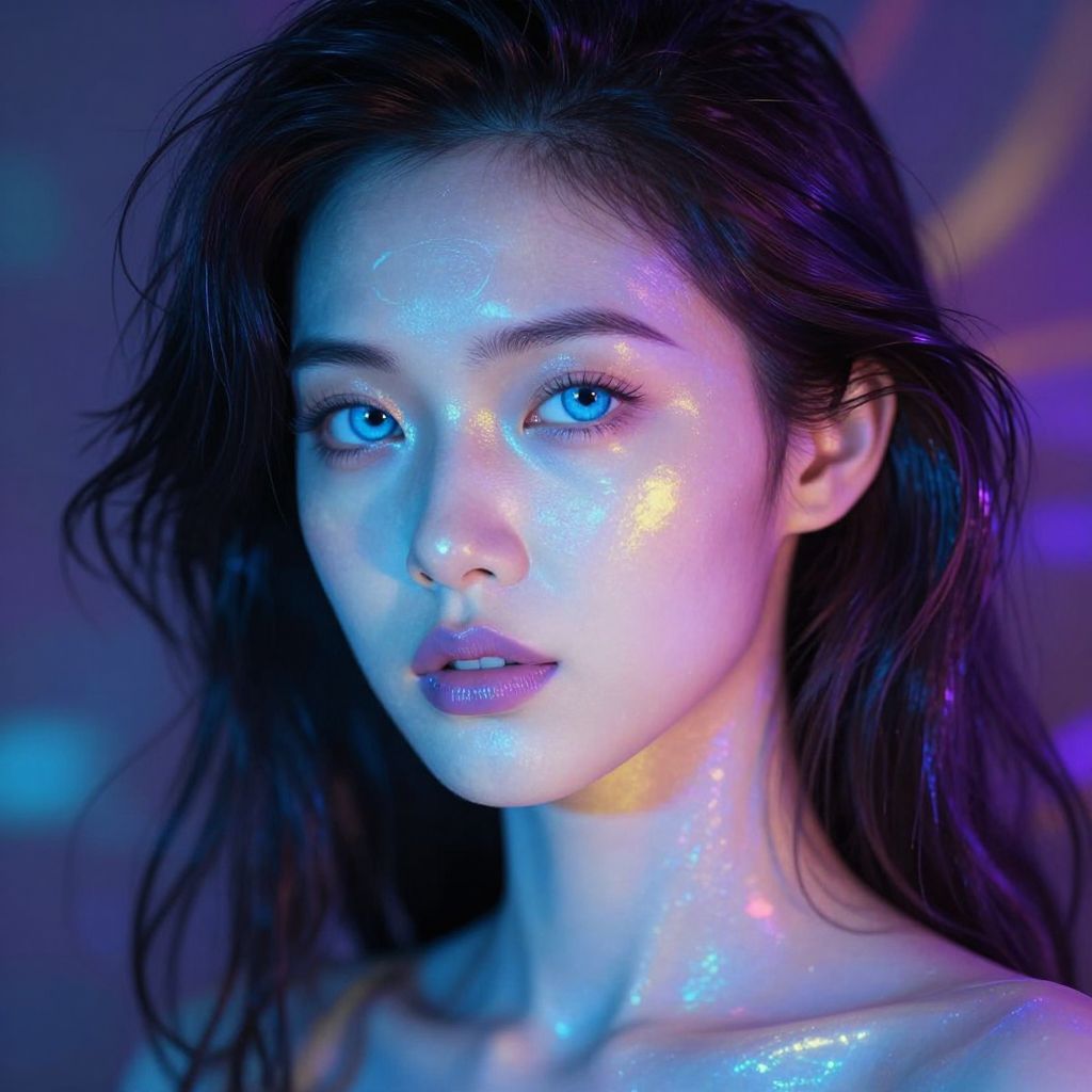 Photorealistic digital portrait of a young woman with glowing blue and purple highlights on her face, wet dark hair, and striking blue eyes, set against