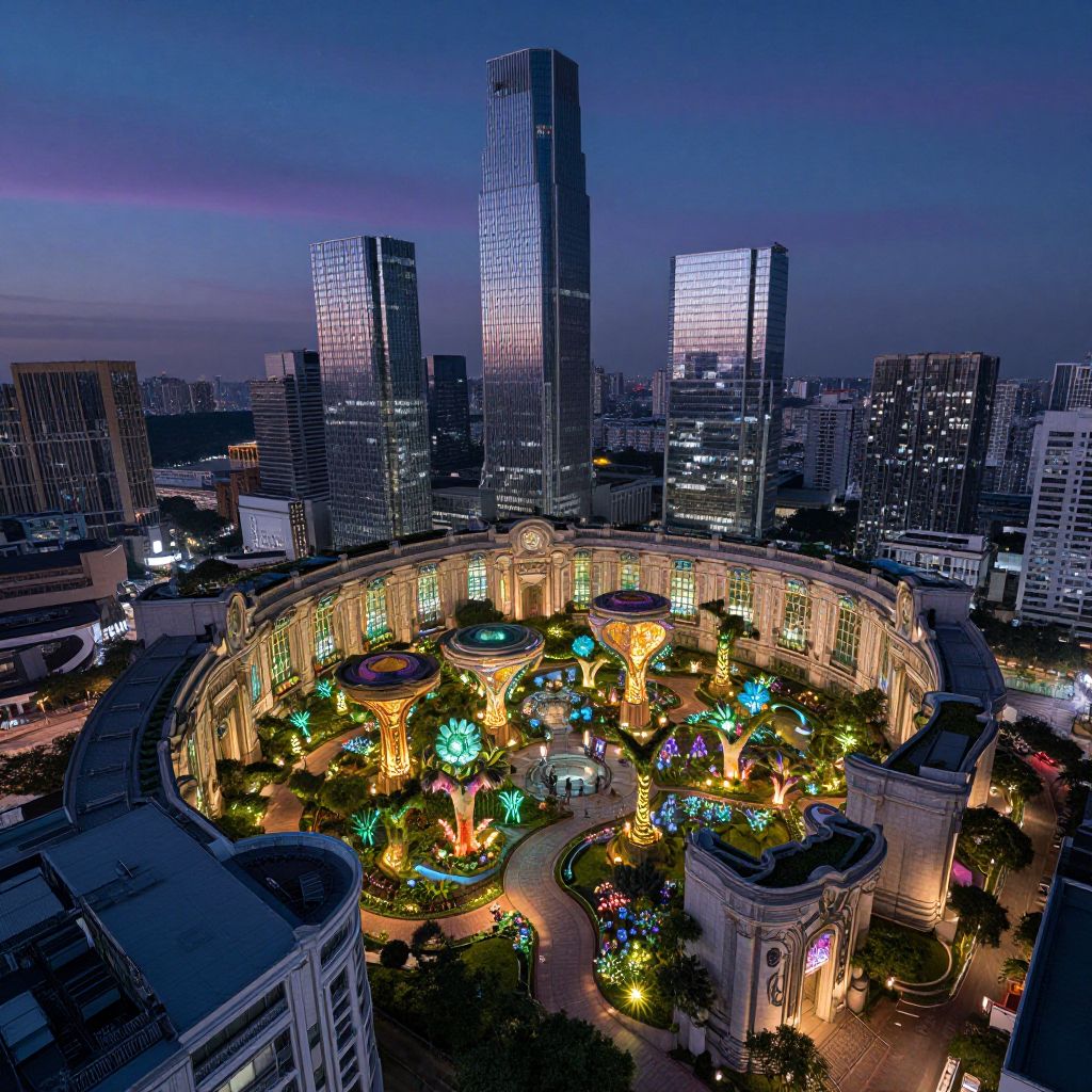 An aerial perspective reveals a captivating night-time cityscape where classical art nouveau motifs intertwine seamlessly with contemporary architecture. The sky above is a canvas of cool blue and purple hues, punctuated by the gentle glimmer of stars that mirror on the glassy skyscrapers below. Nestled amidst this urban panorama is an enchanted garden, its pathways adorned with organically shaped trees and luminescent flora that radiate an otherworldly glow. This magical refuge stands in sharp contrast to the surrounding technological behemoths, fostering a sense of serenity within the bustling metropolis and sparking curiosity about the wonders concealed within the concrete labyrinth. The scene is masterfully rendered in a digital art style that balances hyper-realistic precision with fluid, artistic curves reminiscent of Alphonse Mucha's work, harmoniously fusing timeless elegance with cutting-edge innovation.