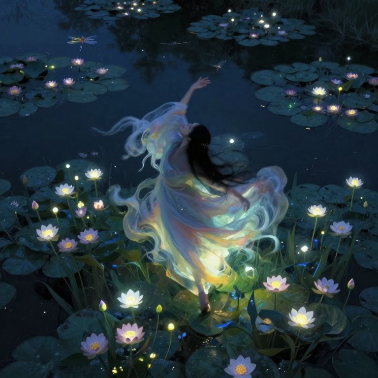 Compose an image reminiscent of an impressionistic oil painting, depicting a tranquil scene of a lone figure in a flowing, otherworldly gown standing at the water's edge of a foggy lagoon. The figure, her back towards the viewer, emanates enigma as she contemplates the distant horizon bathed in luminous shades of lavender and magenta. Her silhouette faintly mirrors on the undulating water, its surface shimmering under the influence of a soft wind. In the background, hazy, softly defined mountains extend into the sky, creating an ethereal ambiance that radiates peace and reflection. This whimsical scene should be rendered using bold brushstrokes and a gentle fusion of pastel colors to express motion and dimension, beckoning the viewer on a fantastical voyage beyond the tangible world.