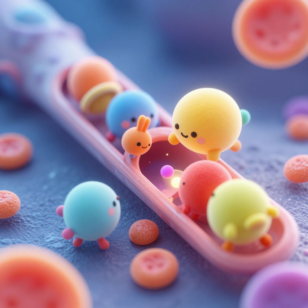 Cute cartoon platelets depicted as small animated creatures racing to seal a blood vessel injury, colorful and highly detailed microscopic view of cells, soft lighting and smooth gradients, appealing to children and educational purposes