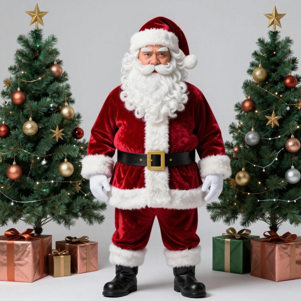 (full body view of (Asian) santa claus), (wearing Christmas themed outfit and accessories, intense stare), best quality, 8k, hyper detailed, ultra high res, photorealistic, high resolution, detailed raw photo, Christmas theme, holiday photo, Crimson, Burgundy, Ruby Red, Hunter Green, Emerald Green, Pine Green, Forest Green, Christmas Green, siver, gold, bronze, copper, rose gold, masterpiece