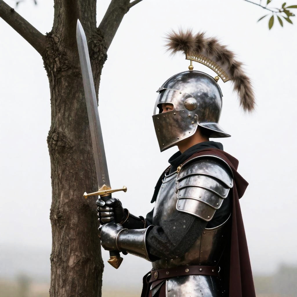 Helmet, armor, solo, tree, white background, weapon, from side, 1boy, simple background, helm, full armor, sword, male focus, 1other, upper body, holding, ambiguous gender, shoulder armor, profile, cape, plume, holding weapon, pauldrons, nature, gauntlets