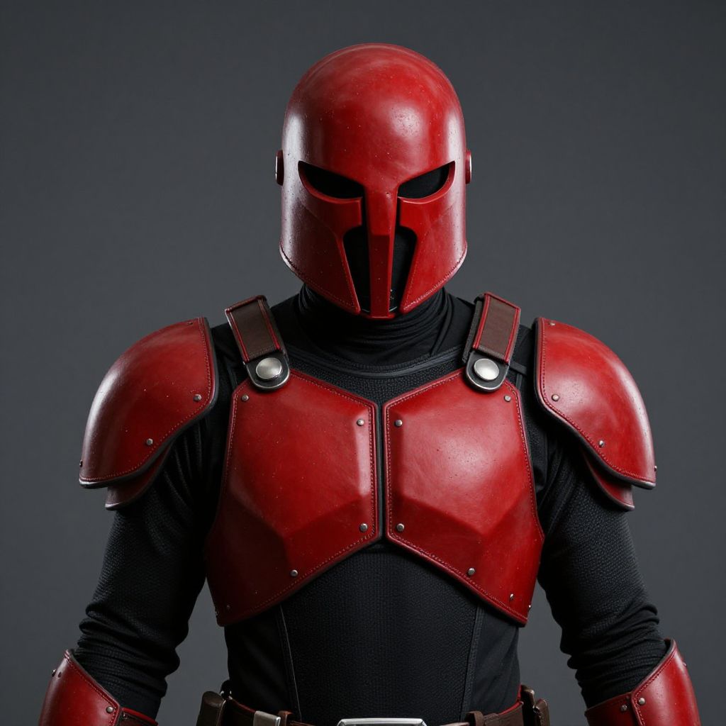 Photograph of a person in futuristic, red metallic armor with a shiny, helmeted face featuring black, angular eye slits. The armor includes shoulder pauldrons and a chest plate, with black mesh visible underneath. The background is a solid, dark gray, highlighting the bright red armor. The helmet has a smooth, polished texture, and the shoulders have a slightly rounded, yet angular design. The person's gender is not discernible, and their hands are not visible in the frame. The overall aesthetic is sci-fi and combat-ready.