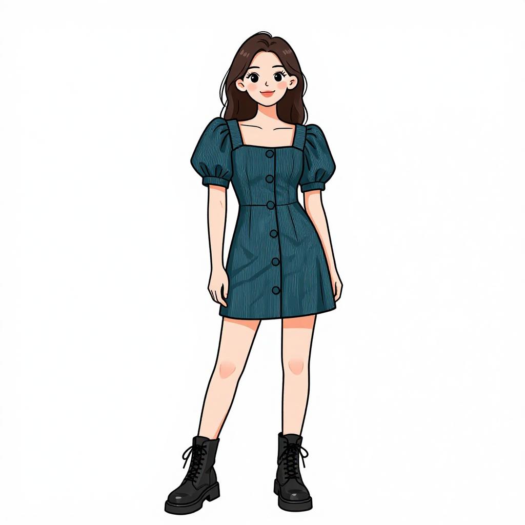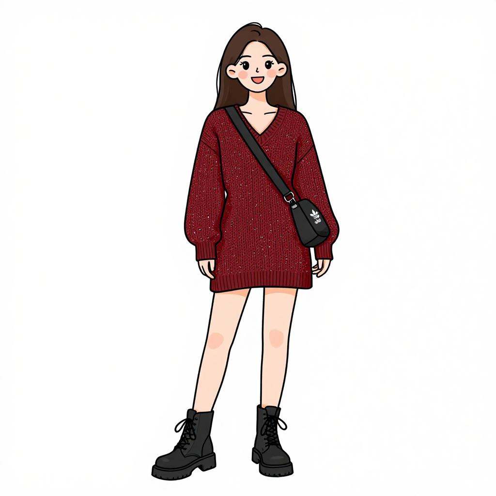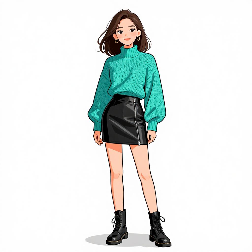 Woman with pretty face and pretty hair. smiling Woman, contemporary casual, oversized turtleneck sweater dress in bold horizontal stripes, color-blocked with shades of pink, blue, and black, ribbed texture, long sleeves, thigh-length, white platform lace-up ankle boots, black socks, minimalistic white studio background. --sref 1467