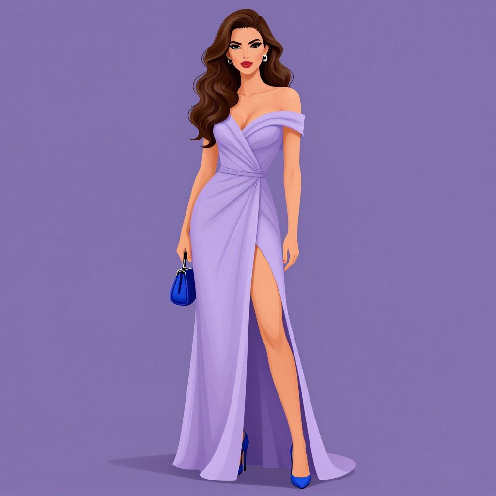 Digital illustration of a tall, slender woman with long, wavy brown hair and fair skin. She is wearing a floor-length, off-the-shoulder, lavender gown with a high slit revealing one leg. She holds a small, blue handbag in her right hand. Her makeup is bold with red lipstick and dark eyeliner. She stands against a plain, light purple background, wearing matching blue high heels. The overall style is elegant and chic, with a focus on fashion.