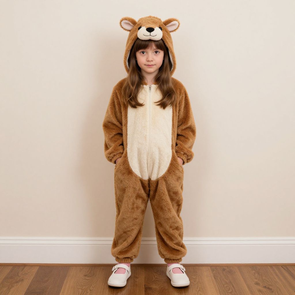 Photograph of a young girl standing in front of a white wall, wearing a brown and beige teddy bear onesie with a hood, white shoes