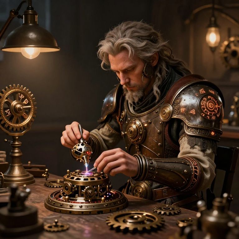 DND artificer art depicting a steampunk-inspired inventor crafting magical mechanical gadgets in a dimly lit workshop, intricate gears and glowing runes highlighting the fusion of technology and arcane power, rich earthy tones and metallic textures.