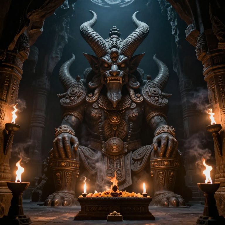 Digital artwork of a fearsome, dark statue with large horns, intricate armor, and glowing fires, seated in a dimly lit, ancient temple.