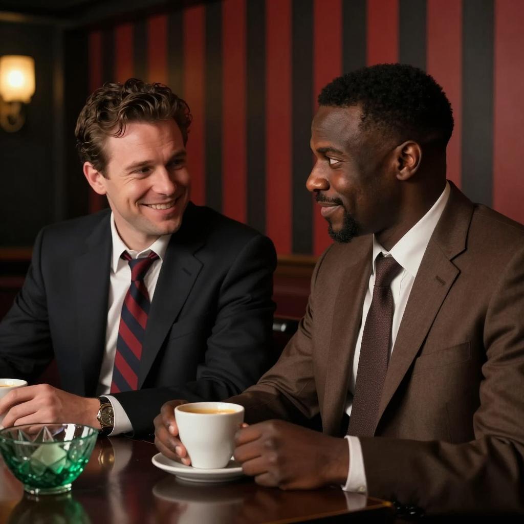 Two men in black suits sit across from each other at a table with a beige tablecloth. The man on the left holds a cigarette pack, looking down. The man on the right looks intently at the other. Between them are two glasses, a salt shaker, and a dish of crackers. A large aquarium with blue water and green plants is in the background. Chandeliers and glassware are visible in the wooden cabinet on the right. Both men have short brown hair.