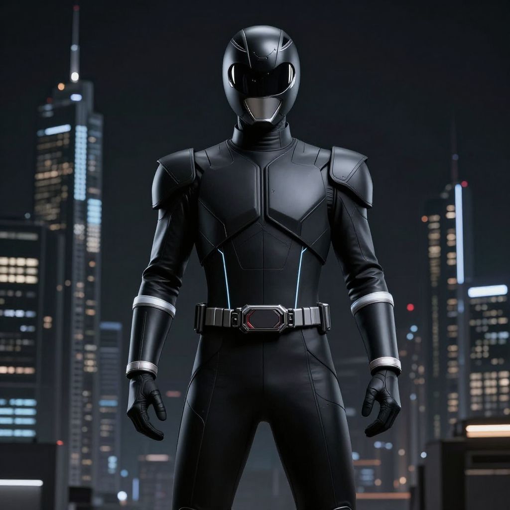 Power Ranger redesign in high-tech minimalist style, matte black suit with sharp edges, subtle neon trim, futuristic city skyline behind, high contrast lighting, ready for battle