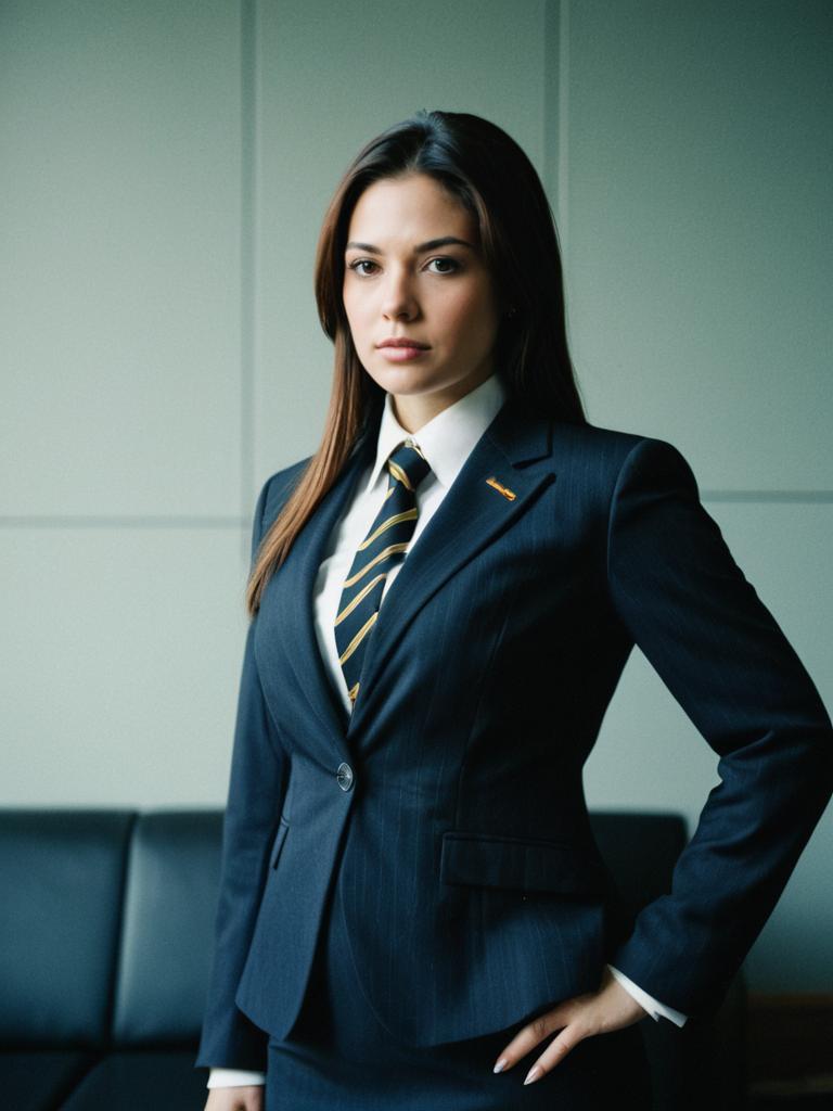 Woman in Formal Business Attire costume, cosplay editorial portrait, cinematic realism