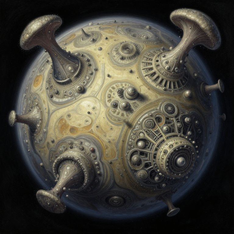 Digital art of a metallic, spherical object with intricate, circular patterns and protruding, mushroom-like structures against a black background.