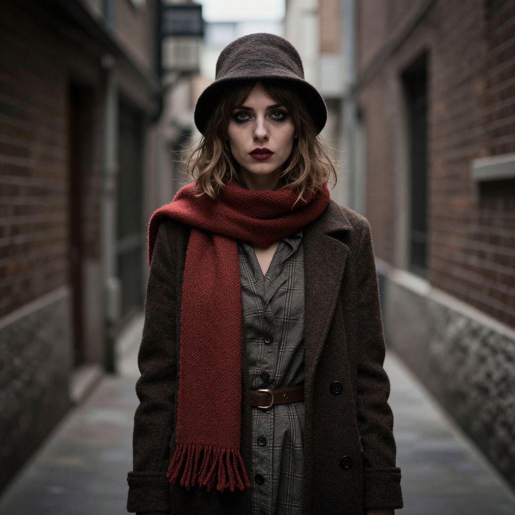 Photograph of a young woman standing in a narrow, urban alleyway with brick walls on either side. She has light skin, blue eyes, and wavy brown hair peeking out from a dark brown felt hat. She wears a dark brown, textured wool coat over a checkered gray shirt, with a thick, red scarf wrapped around her neck. Her makeup is dramatic, with dark red lipstick and smoky eye shadow. The background is slightly blurred, focusing attention on her. The alleyway's pavement is gray, and the overall color palette is muted with dark, earthy tones. The image has a moody, almost vintage style.