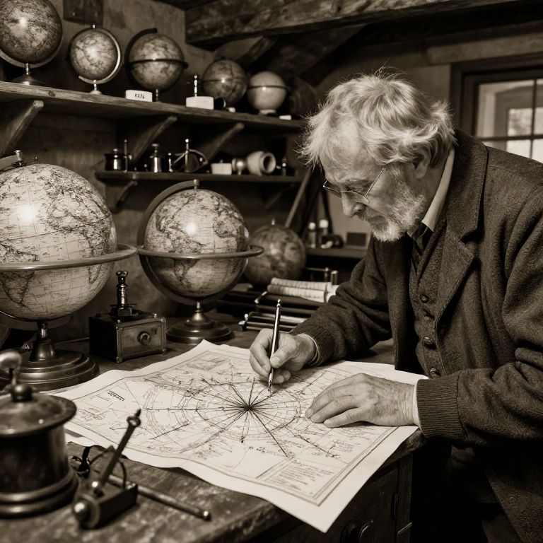 Old-world cartographer in a vintage workshop filled with globes, maps, and navigation tools, dusty shelves and wooden beams, sepia tones, focus on hand-drawn map details, realistic textures, historical authenticity, rustic and scholarly atmosphere
