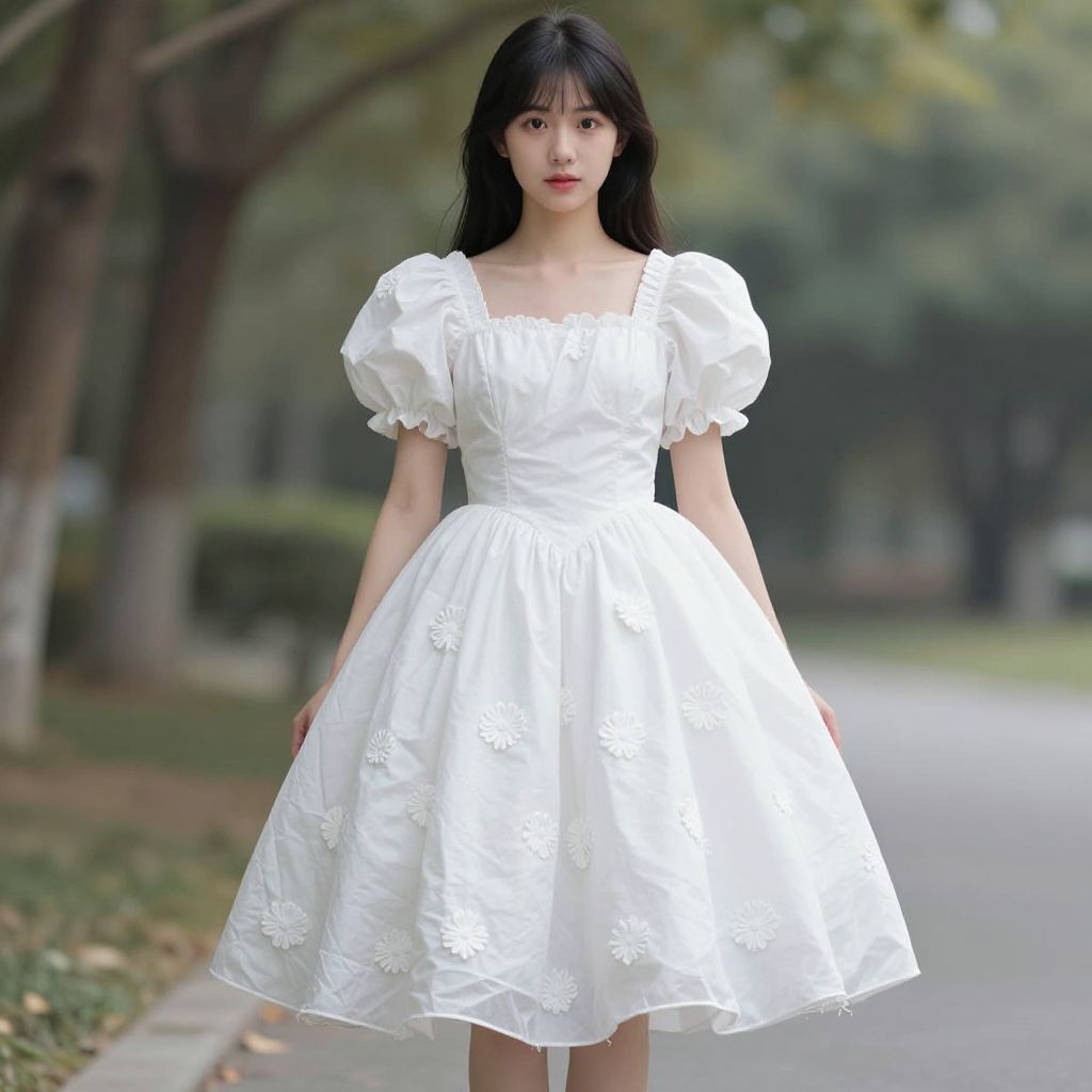 Puffy formal dress, 1girl, solo, flower, dress, white dress, realistic, blurry background, blurry, looking at viewer, black hair, standing, long hair, puffy sleeves