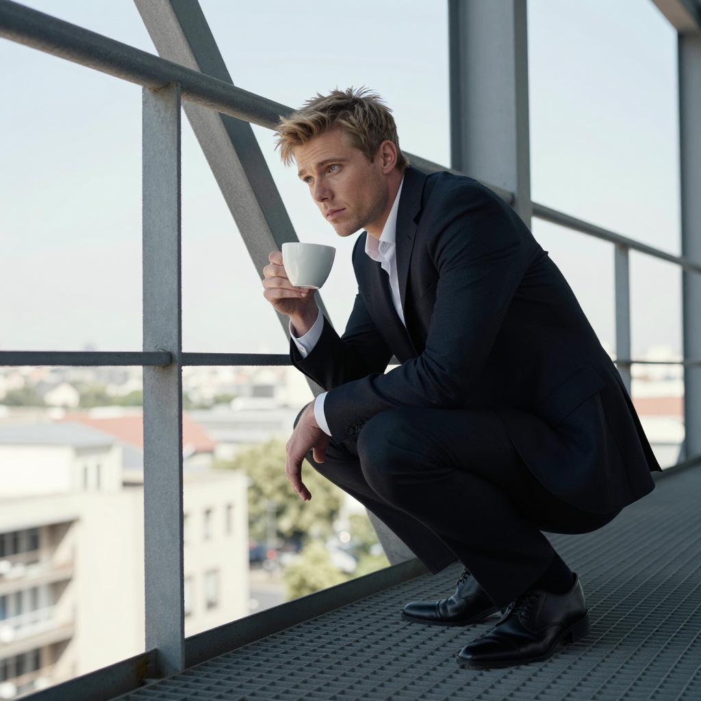 Man with short blonde hair, wearing a dark suit, crouches on a metal balcony with a grid pattern. He holds a cup in his right hand and looks intently to the side. Steel beams frame the background. Urban landscape visible below. Bright daylight. One person.