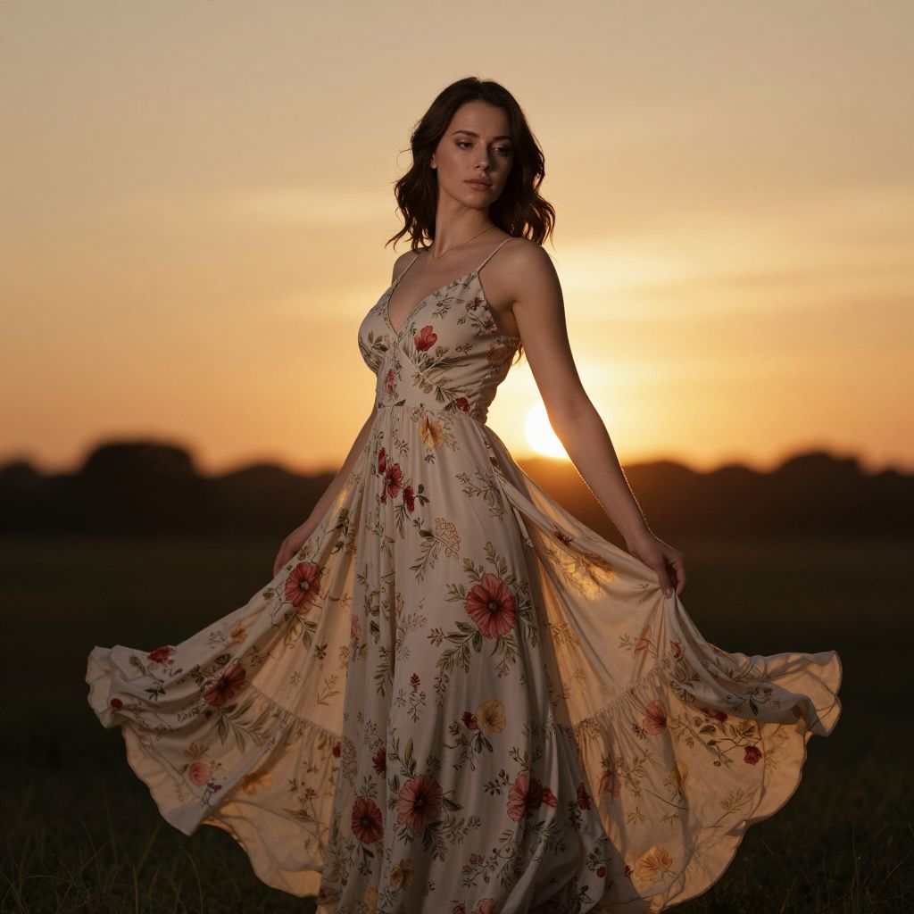 A woman in a flowing floral dress stands gracefully against the backdrop of a golden sunset, capturing the essence of a serene Golden Hour portrait with soft, natural lighting and a dreamy, cinematic quality.