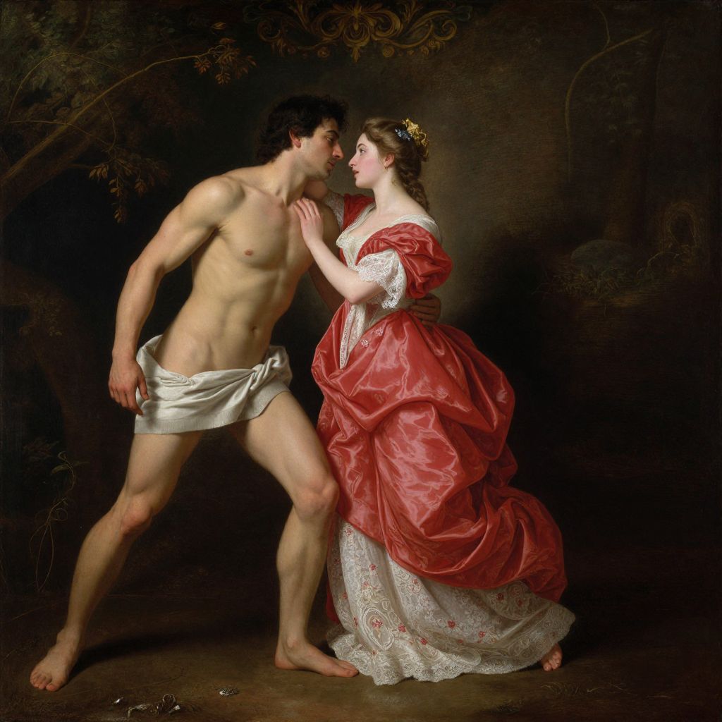 A romantic and classical-style digital artwork reminiscent of Peter Paul Rubens, featuring a muscular, shirtless man and a woman in a flowing red dress adorned with white lace, set against a dark, forested backdrop with dramatic lighting and intricate details.