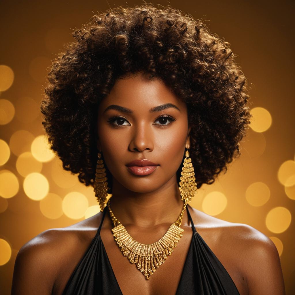 Afro queen wig hair, photorealistic portrait of a beautiful young black woman with voluminous curly brown hair, wearing gold teardrop earrings and a layered gold necklace, black halter top, serious expression, warm brown eyes, golden brown skin, blurry golden background, studio lighting, high detail, soft focus on background, bokeh effect, elegant and regal atmosphere