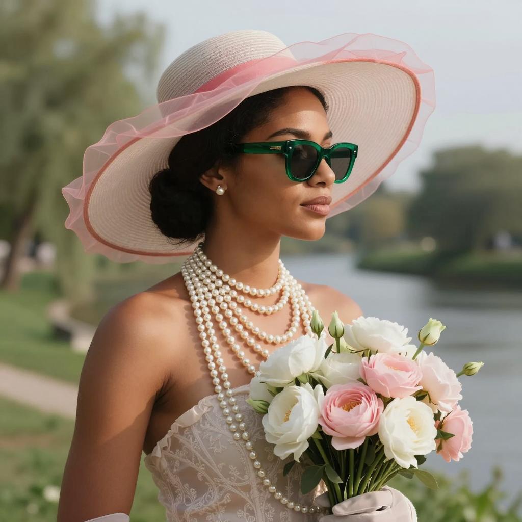 Woman with dark skin wearing large pink and red sheer hat, green sunglasses, and layered pearl necklaces covering her chest. She holds a bouquet of flowers with white and pink blossoms. Her right hand is gloved. Background includes greenery and a river. She is in profile, looking to the right.