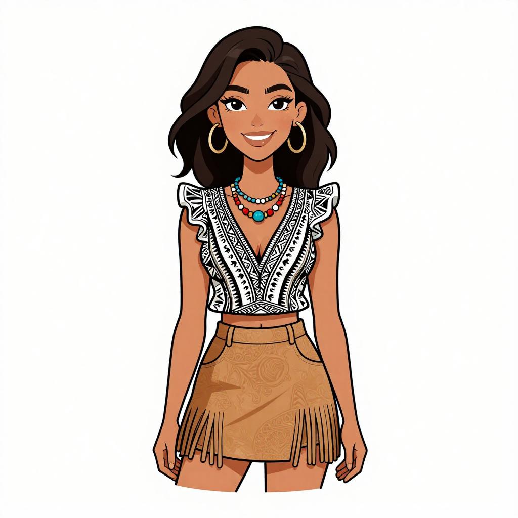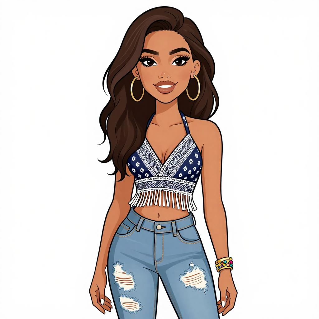 Woman with pretty face and pretty hair. smiling Woman, bohemian, tan suede crop top with fringe detailing, crew neck, sleeveless, light-wash distressed skinny jeans, intricate metallic gold upper arm cuff bracelet. --sref 1467