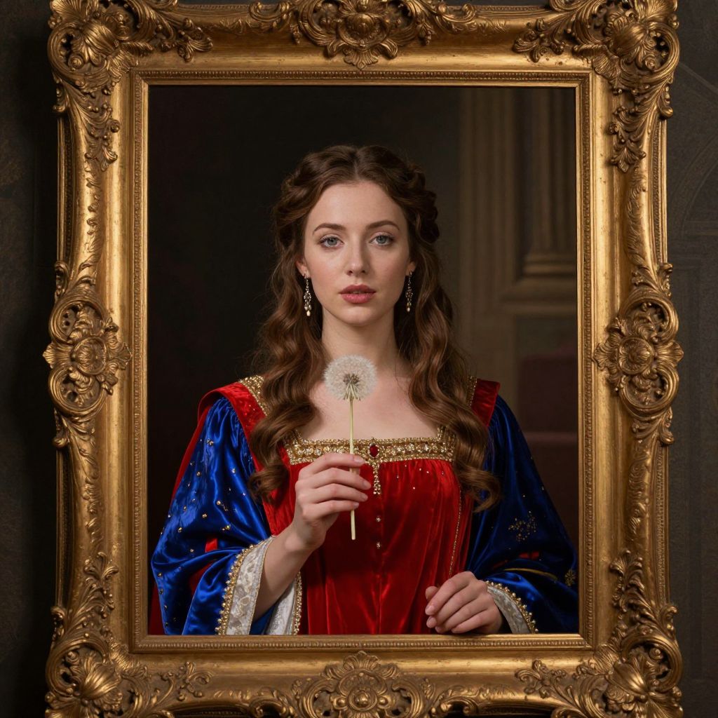 Woman depicted in a regal portrait, framed in ornate gold, holds a delicate dandelion while dressed in vibrant red and blue attire against a dark background with architectural details.