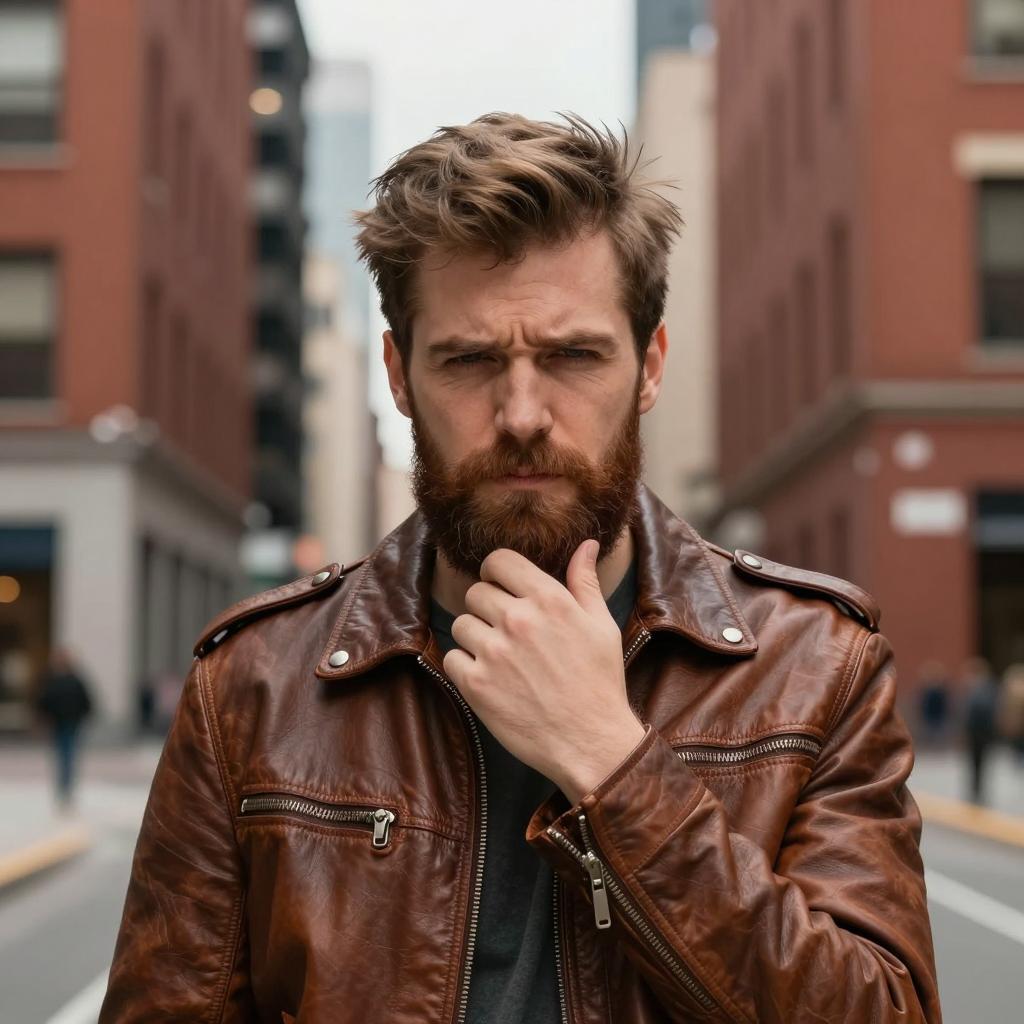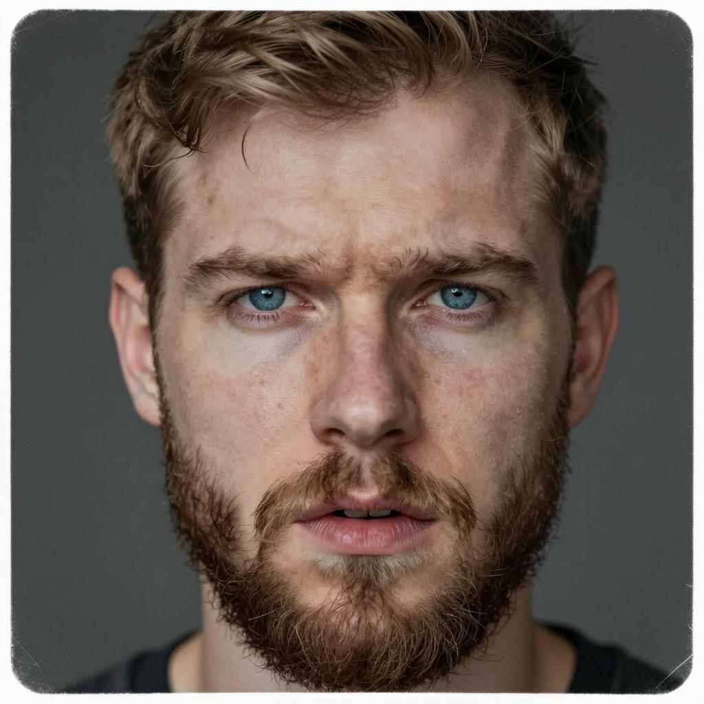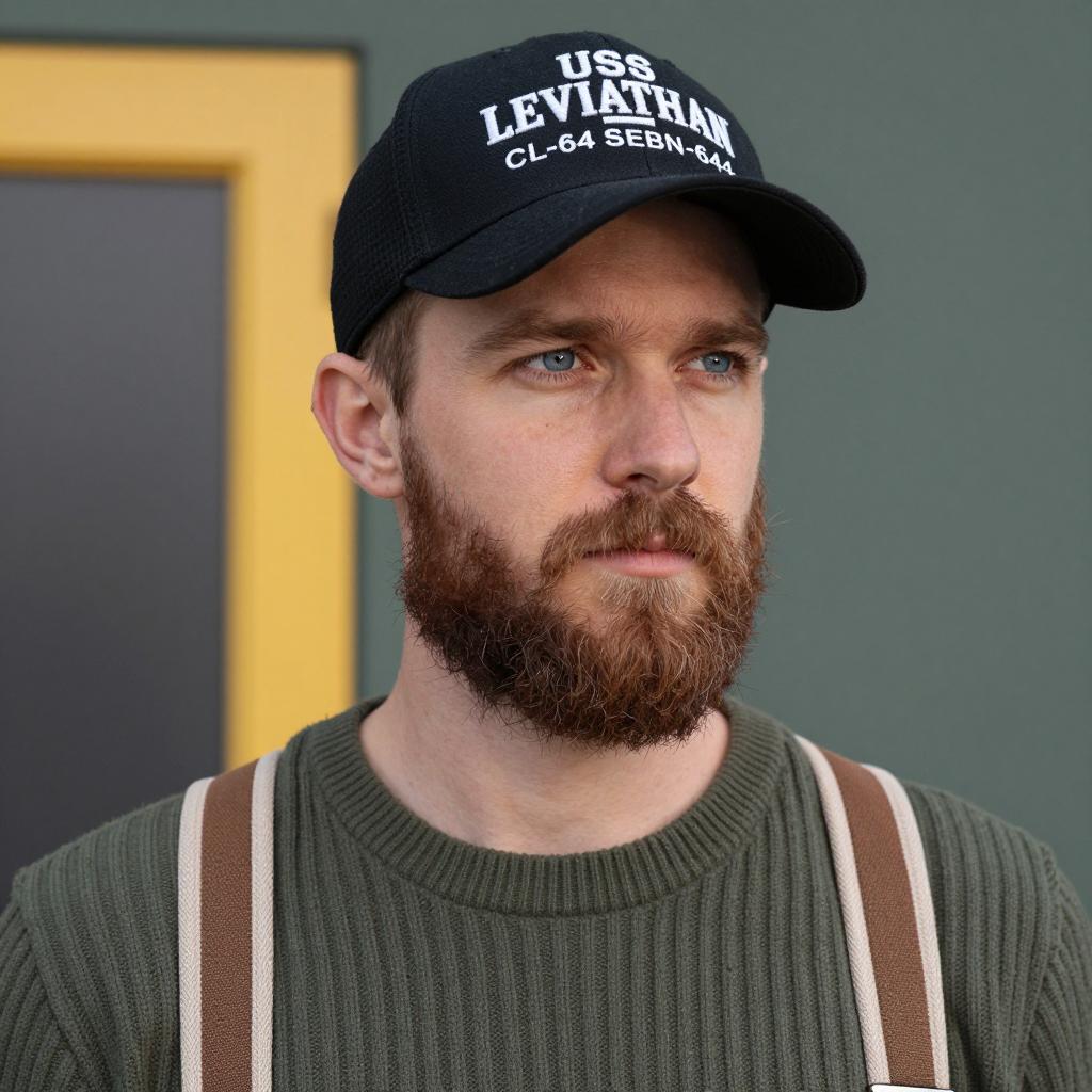 A bearded man with blue eyes wearing a black baseball cap with "USS LEVIATHAN CL-64 SEBN-644" , green ribbed sweater, and brown suspenders. Background includes a blurred yellow-framed object and green wall. Man looks slightly to the right, with a neutral expression.