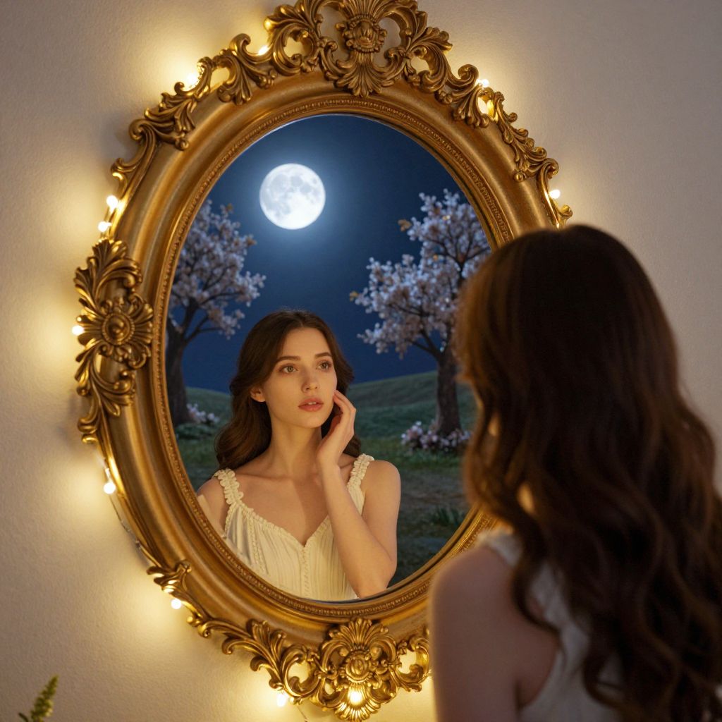 Photograph of a young woman with long, wavy brown hair, reflected in an ornate, gold-framed oval mirror. She gazes at her reflection with a contemplative expression, touching her cheek with her right hand. She wears a sleeveless, white, lace-trimmed dress. The mirror's frame is illuminated by soft, yellow lights, creating a warm glow. The background in the mirror reflects a night scene with a full moon and blossoming cherry trees. The image blends realism with a dreamy, romantic atmosphere, highlighting the contrast between the warm mirror frame and the cool, moonlit night scene.
