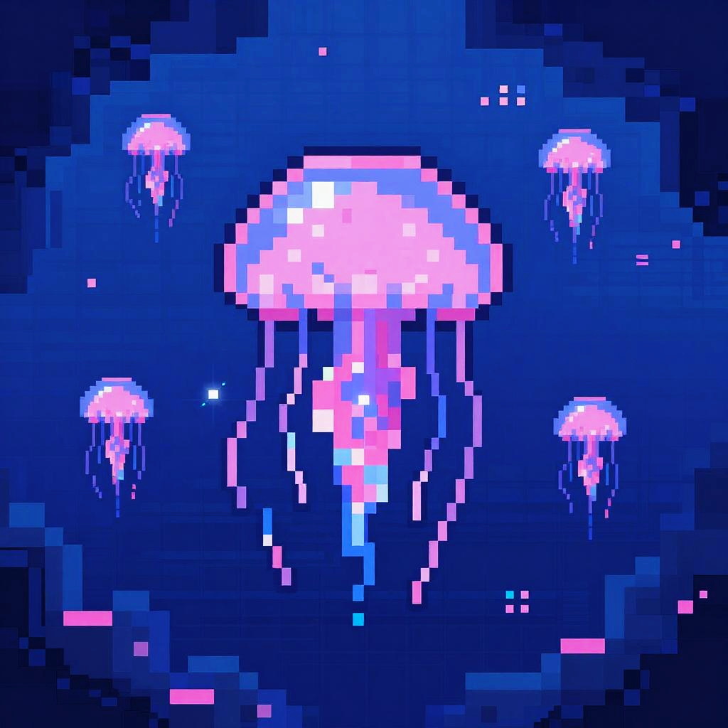 Pixel art of a glowing blue and pink jellyfish with trailing tentacles, floating in a dark blue underwater scene with scattered light squares.