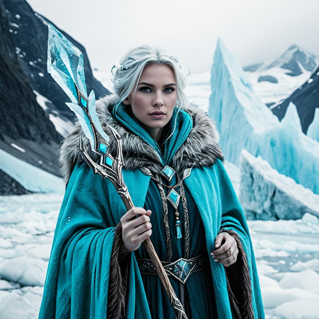 Portrait of a fantasy ice mage woman with pale skin and frosted eyelashes, dressed in a turquoise fur-lined cloak and ornate jewelry, holding a crystal staff. She stands in an icy, glacier-filled mountainous landscape, exuding a cold, magical aura.