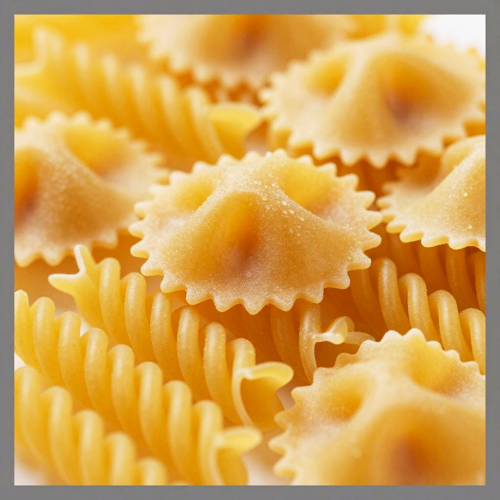Close-up photograph of a pile of yellow pasta shapes, including rotini, penne, and ravioli. The pasta is stacked in multiple layers, with the rotini and penne in the foreground and ravioli in the background. The image has a bright, warm yellow tone, with a soft, blurry effect in some areas, giving it a slightly dreamy look. The edges are bordered by a gray frame.