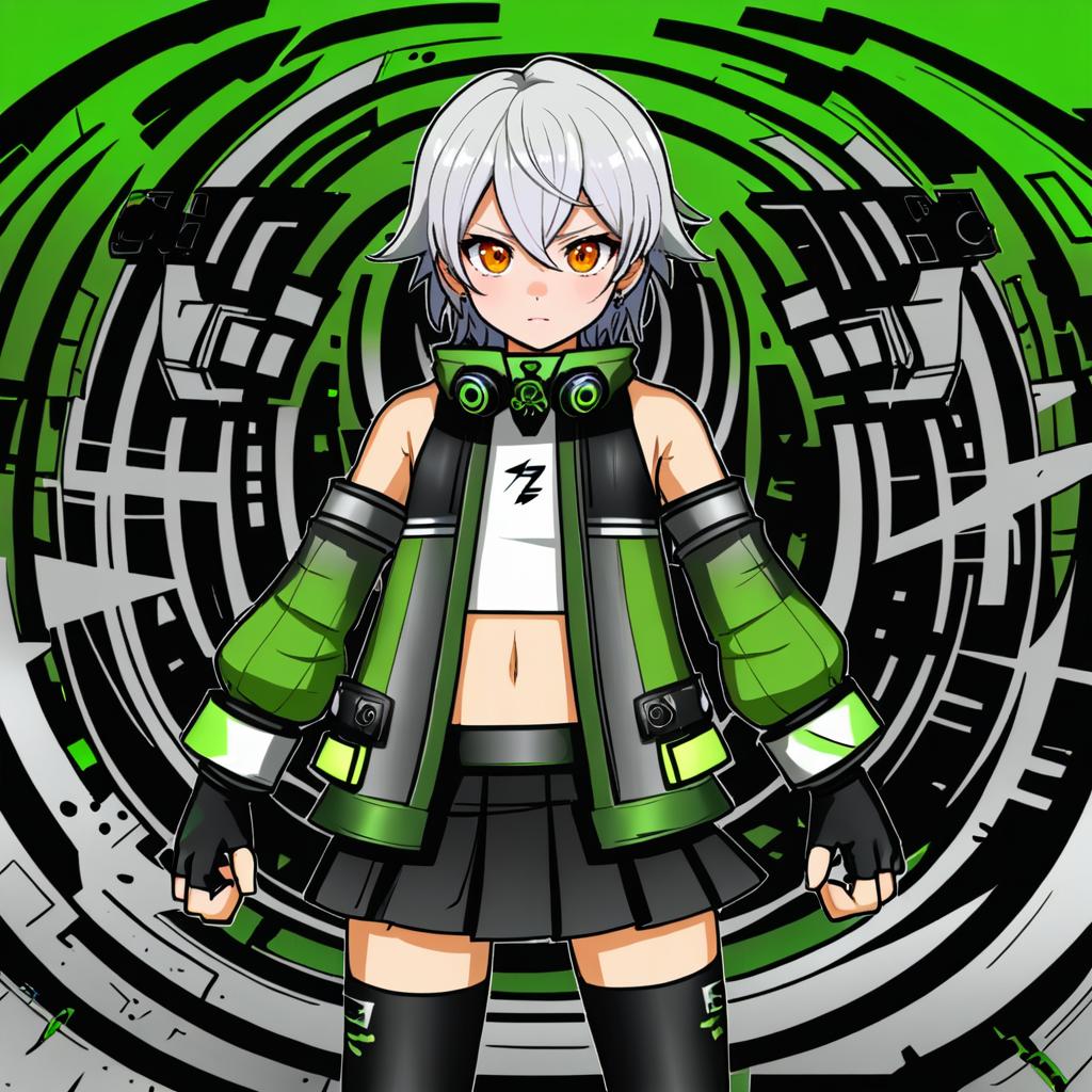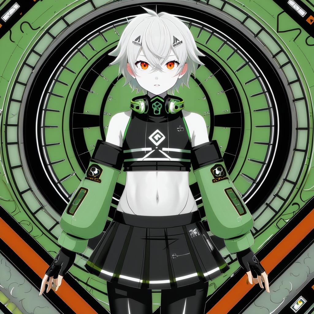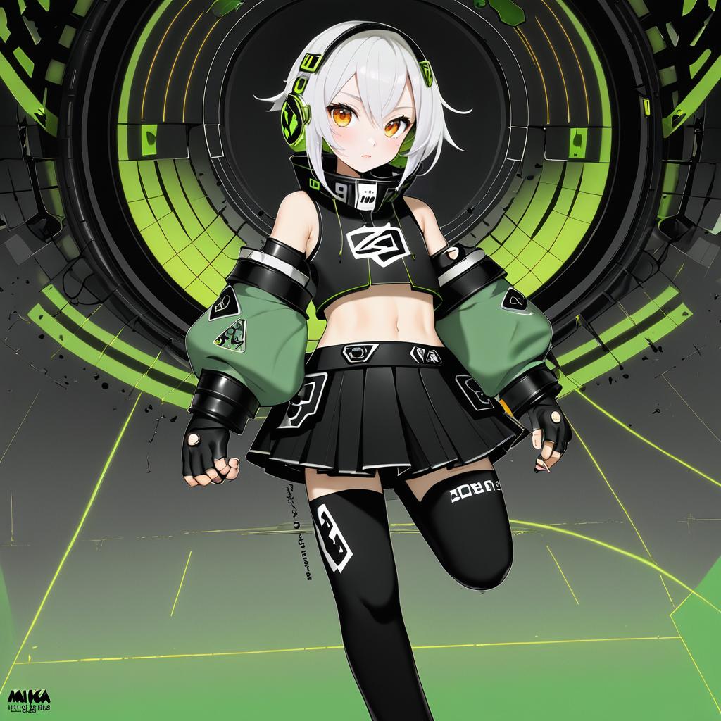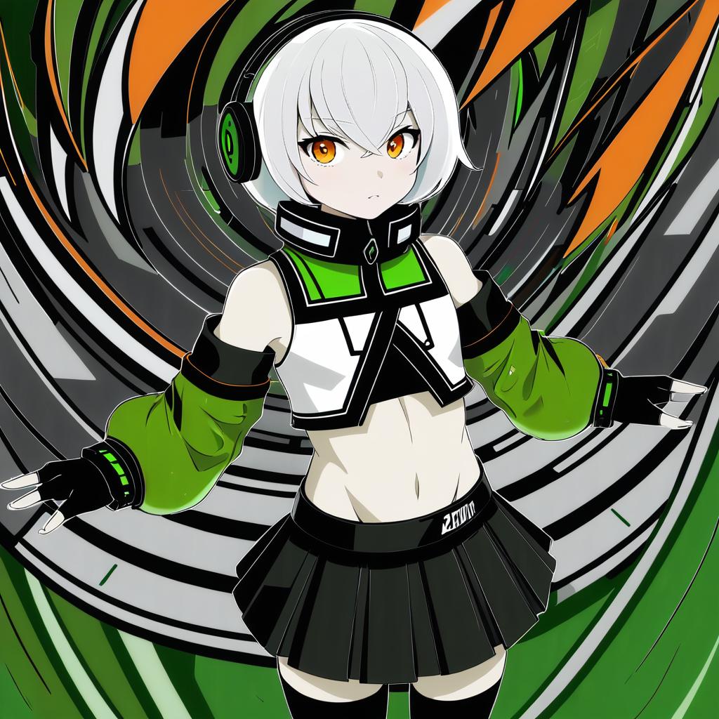 Digital anime illustration of a young female character with short white hair and orange eyes. She wears black headphones, a black cropped top with exposed midriff, a black pleated skirt, green detached sleeves with long sleeves, and black thigh-high socks with fingerless gloves. The background features futuristic circular neon green and black geometric designs.