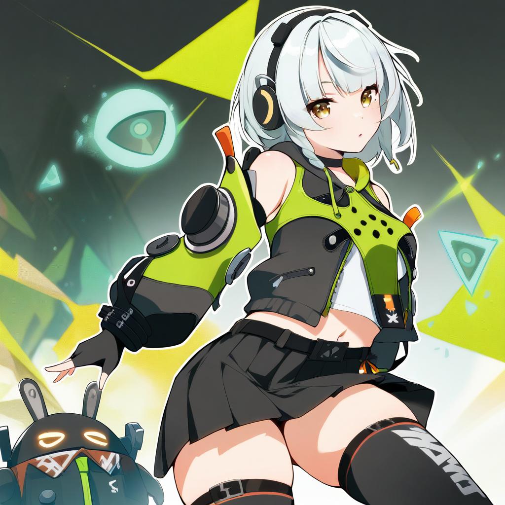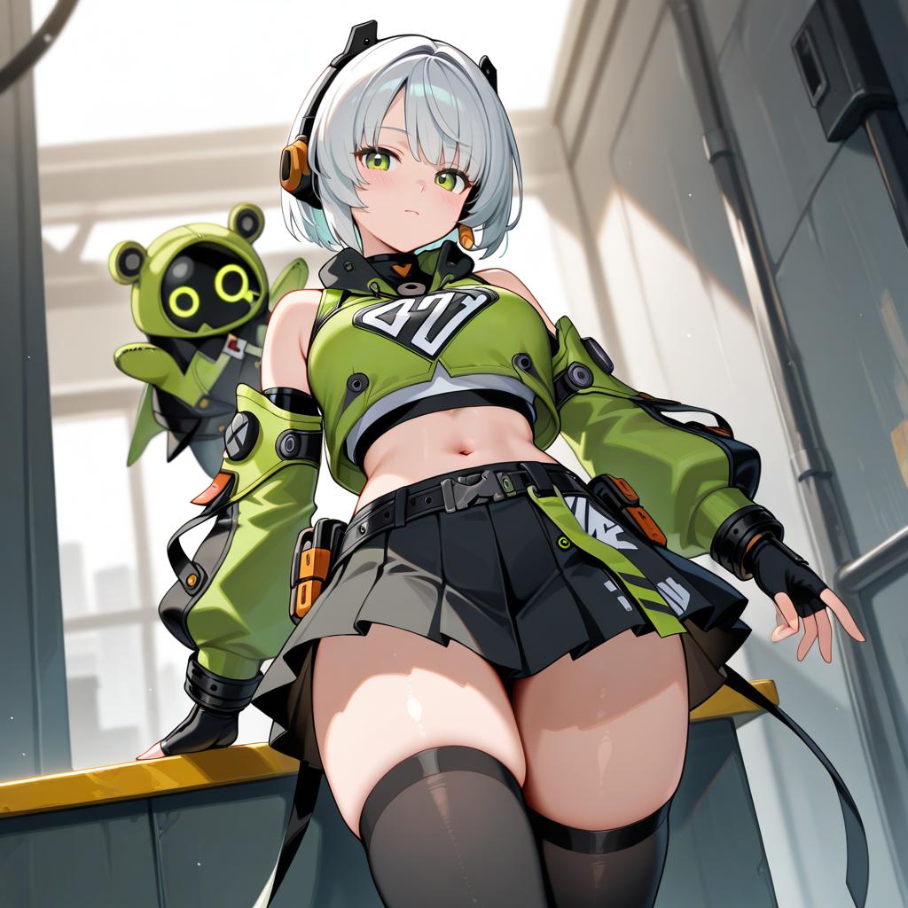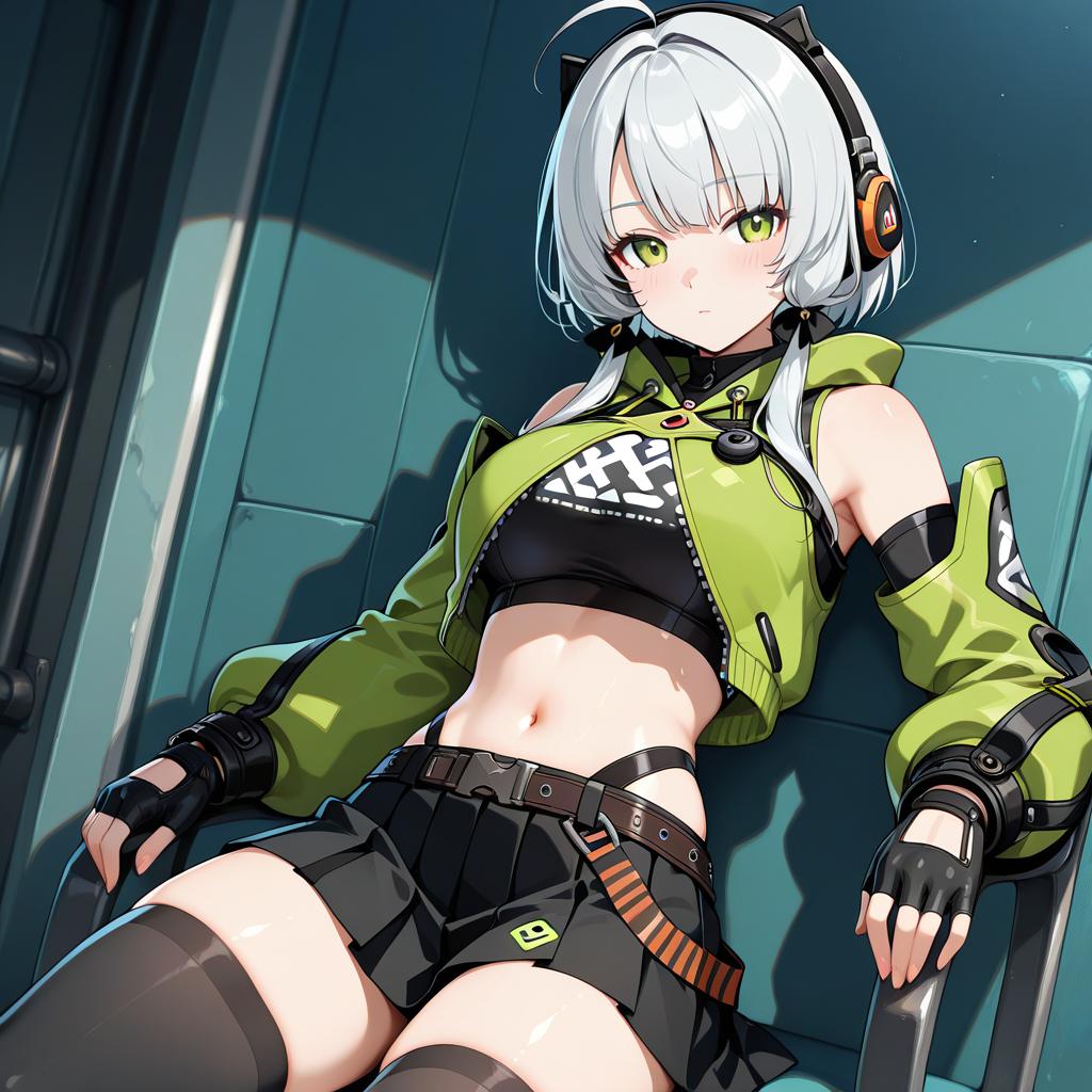 Anby demara, zenless zone zero, 1girl, orange eyes, short hair, grey hair, white hair, navel, headphones, black skirt, black thighhighs, fingerless gloves, black gloves, pleated skirt, green jacket, bare shoulders, detached sleeves, long sleeves, midriff, by artist mukka, anime