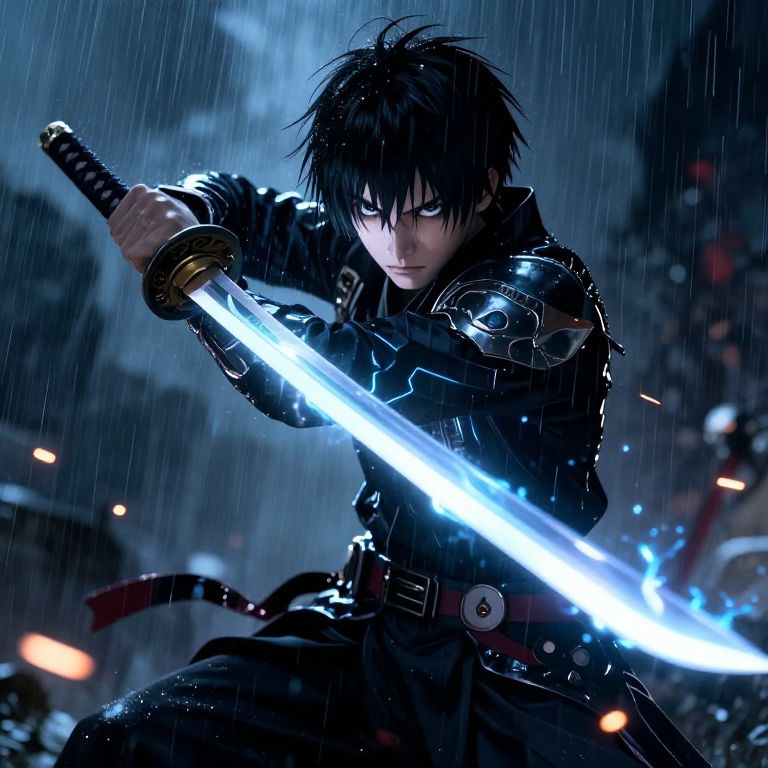 Hot anime guy with black hair wielding a glowing katana in a stormy battle scene, sparks flying, rain pouring, intense eyes focused on the enemy, dynamic action pose, detailed armor with futuristic design, dark moody colors with electric blue highlights.