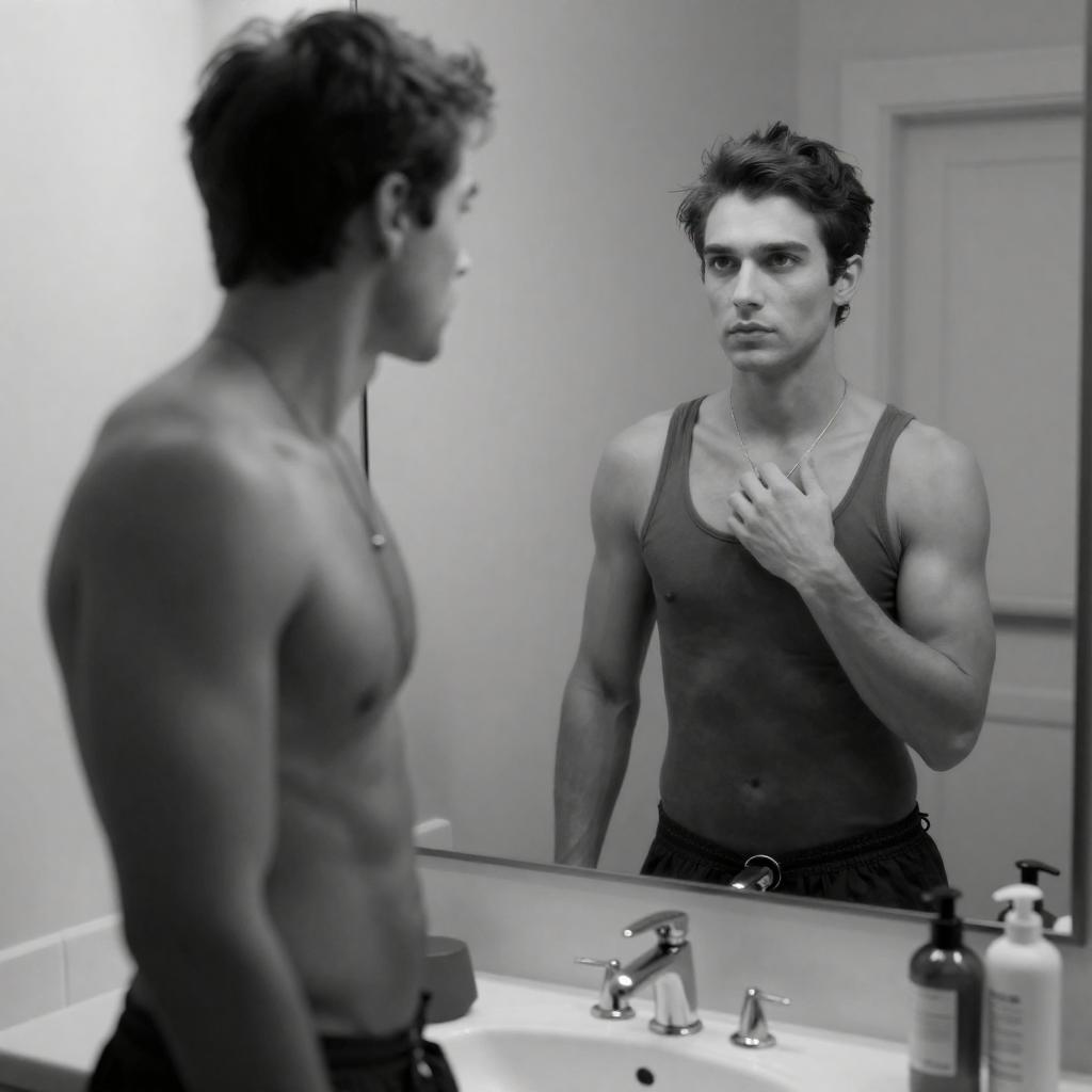 Black-and-white photograph. Shirtless man with short dark hair, muscular build, necklace, left profile, facing woman with short hair, sleeveless dark dress, hand near chest, reflected in mirror. Woman's intense gaze, man's focused expression. Bathroom setting. Mirror, sink, toiletries in background.