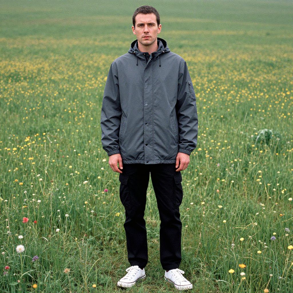 A man stands confidently in a vibrant orange safety jacket among tall trees in a serene forest. The contrast of his outfit against the lush greenery highlights his role in outdoor work or environmental conservation.