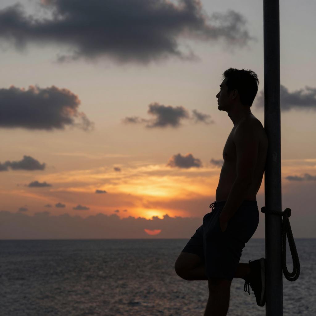 Silhouetted man leaning against a pole with ropes, standing by a calm sea. Orange and dark clouds fill the sunset sky. Man's posture is relaxed, hands on hips. Ropes hang from the pole on the right. Ocean water reflects sunset colors.