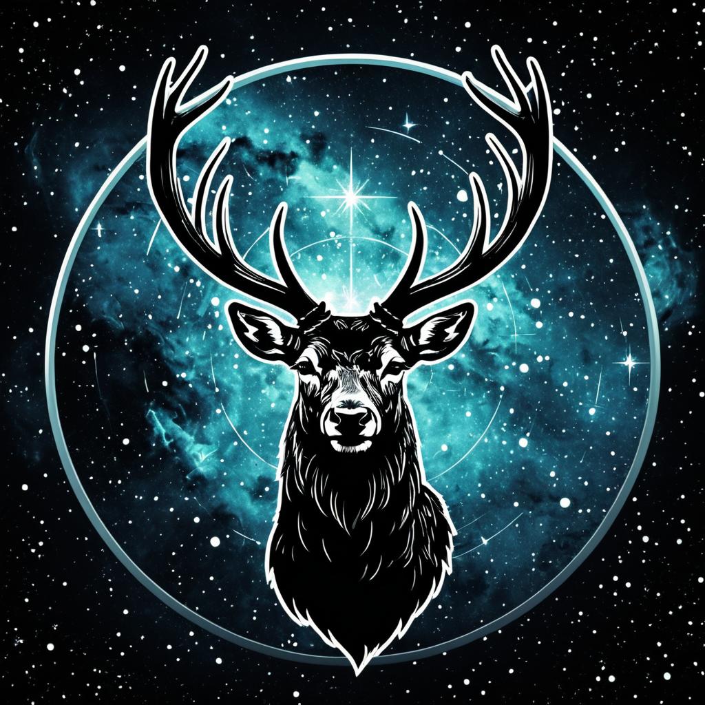 High Dynamic Range (Hdr) abstract emblem, serene stag, wisdom, spirituality, celestial nebula, dark atmosphere, 2D minimalistic style.