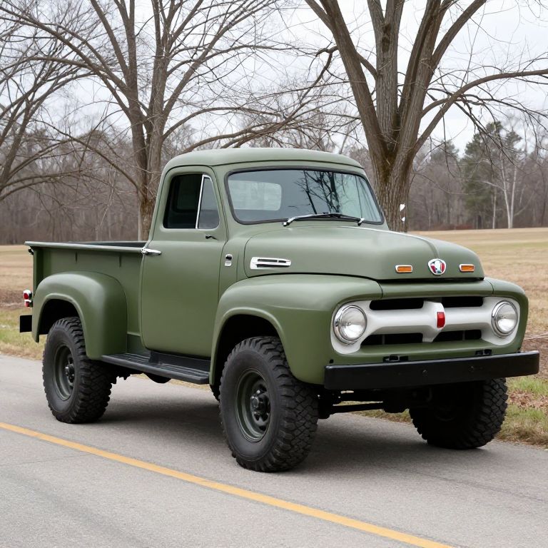 Vintage olive-green 1949 Ford F-1 pickup truck parked on a paved road, showcasing its rugged 4x4 design against a backdrop of bare trees and open fields.