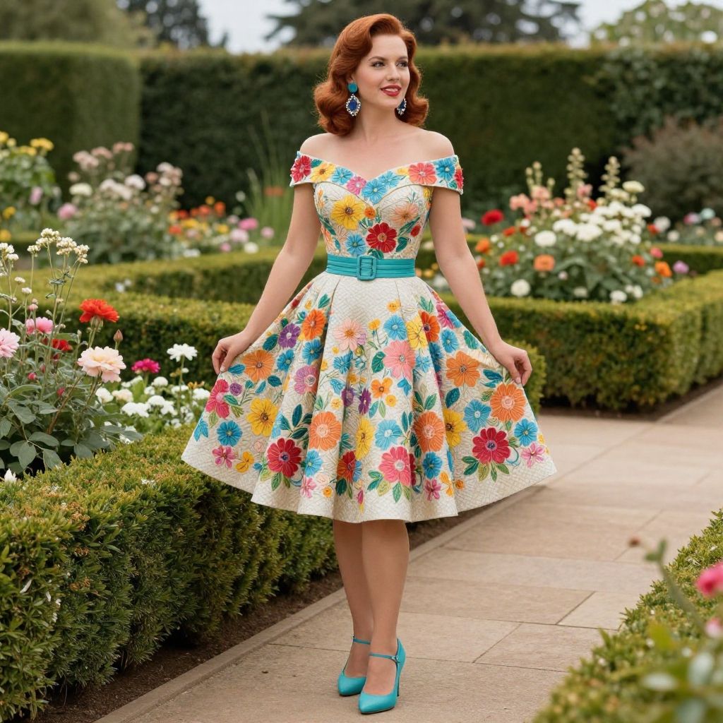 Ultra-realistic photo of a glamorous woman modeling a vintage-inspired cocktail dress with colorful floral embroidery and an off-shoulder neckline. The dress features a cinched waist and flared skirt, styled in a retro chic design. She stands in a vibrant blooming flower garden with manicured hedges and a stone pathway, evoking the elegance of a high-fashion outdoor garden party. The woman has red hair styled in classic waves, wears statement earrings and matching teal heels.