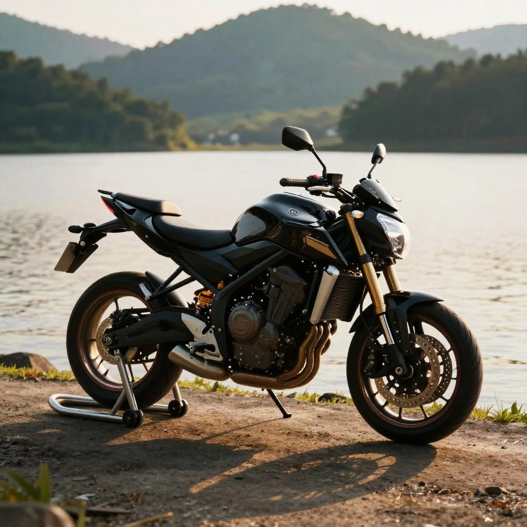 Photograph of a sleek, black motorcycle on a metallic stand, positioned on a rocky shoreline. The bike's shiny, reflective wheels catch the sunlight, creating bright highlights. In the background, there's a calm lake with a forested mountain on the horizon. The scene has a serene, early morning or late afternoon light, casting soft shadows. The motorcycle appears modern and stylish, contrasting with the natural, peaceful setting.