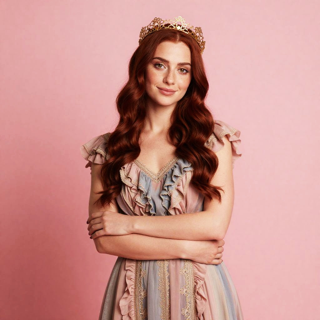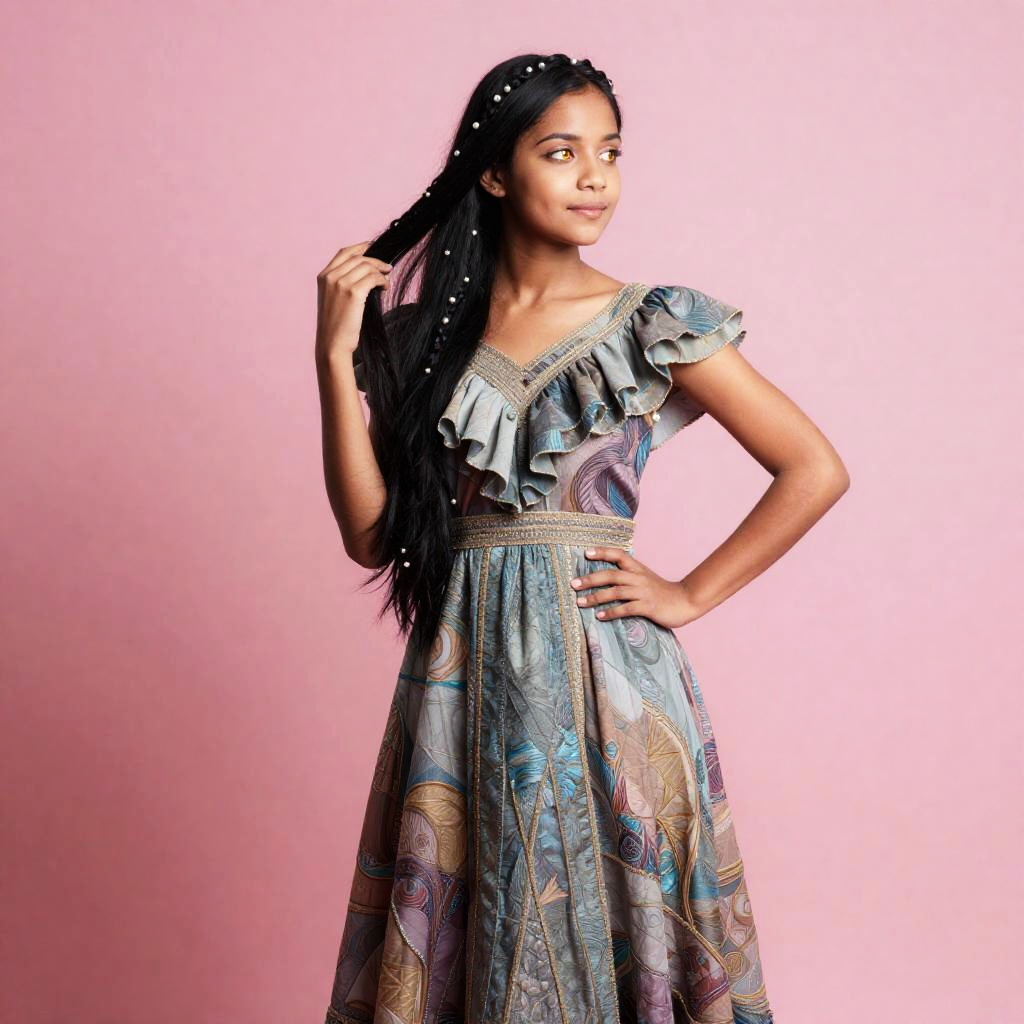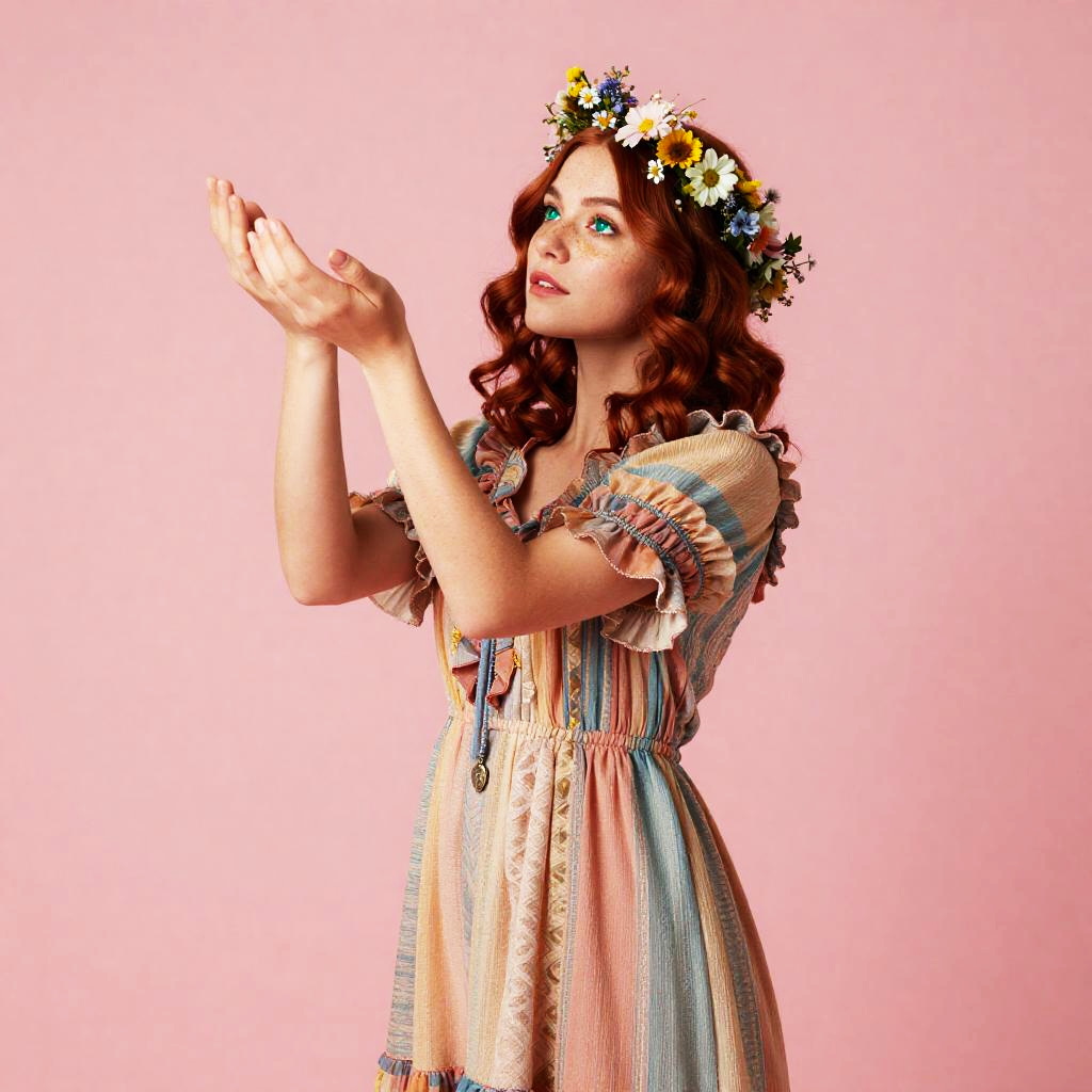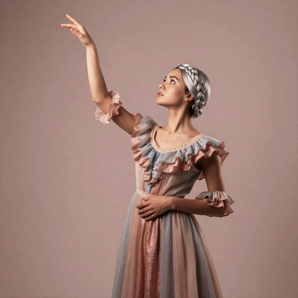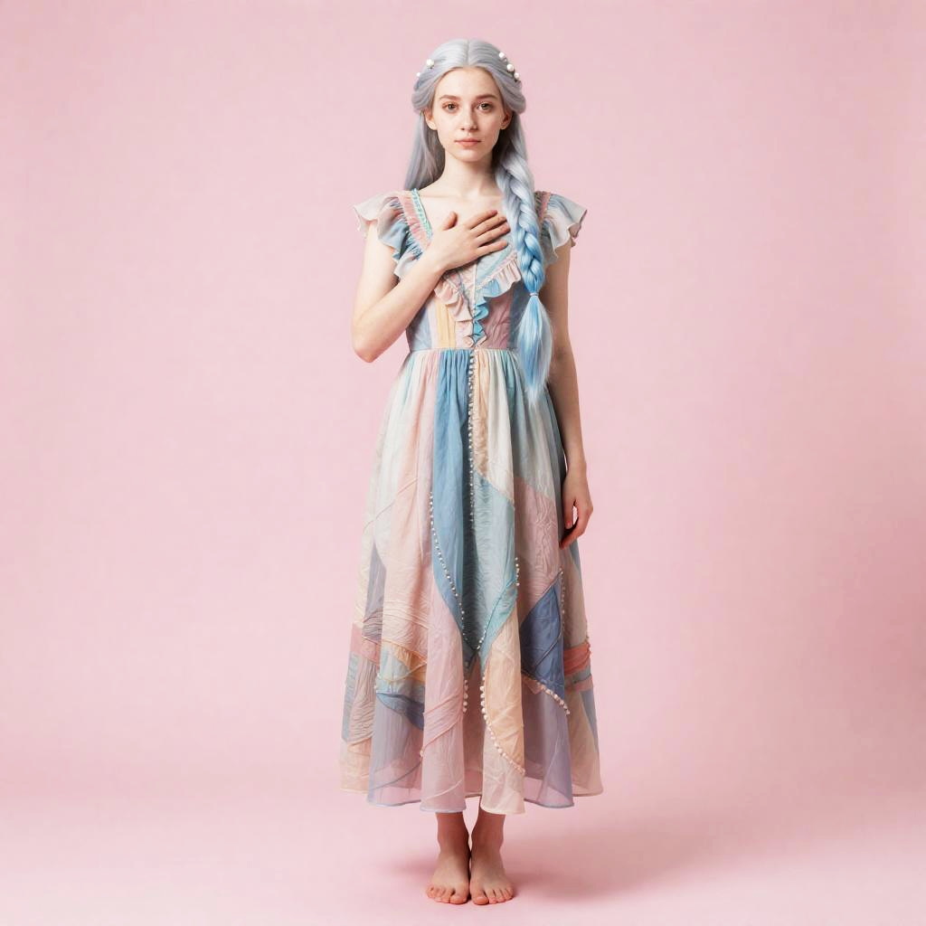 Full body, 1girl, solo, young woman with long silver-blue hair braided with tiny pearls and gentle hazel eyes, subtle freckles across her nose, intricate dress, ruffled sleeves, layered fabric, soft pastel hues, vibrant texture, soft curtsey with one hand over her heart, serene expression, artistic flair, harmonious colors, blush pink background