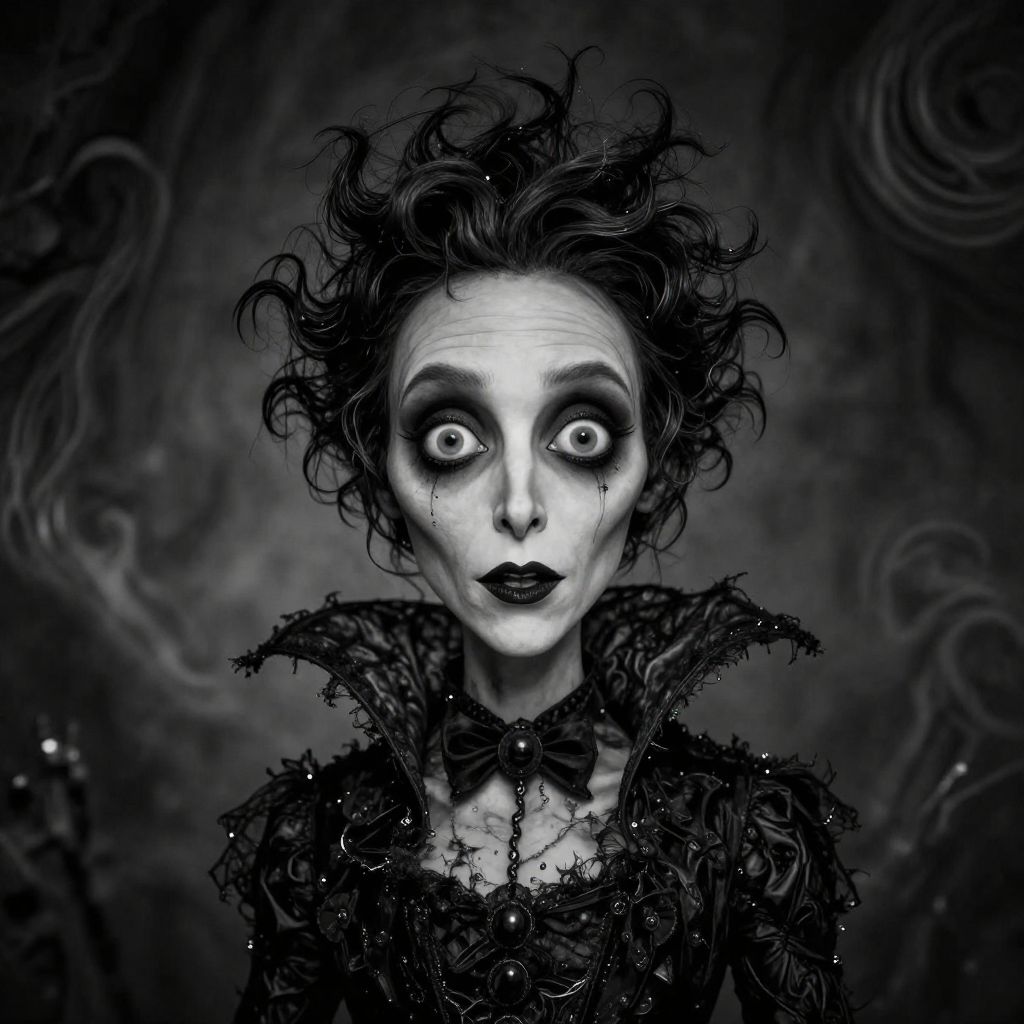Tim Burton AI filter style portrait of a whimsical gothic character with exaggerated features, dark swirling background, eerie yet charming atmosphere, monochrome with hints of vibrant colors, surreal and dreamlike elements, detailed shadows and textures.