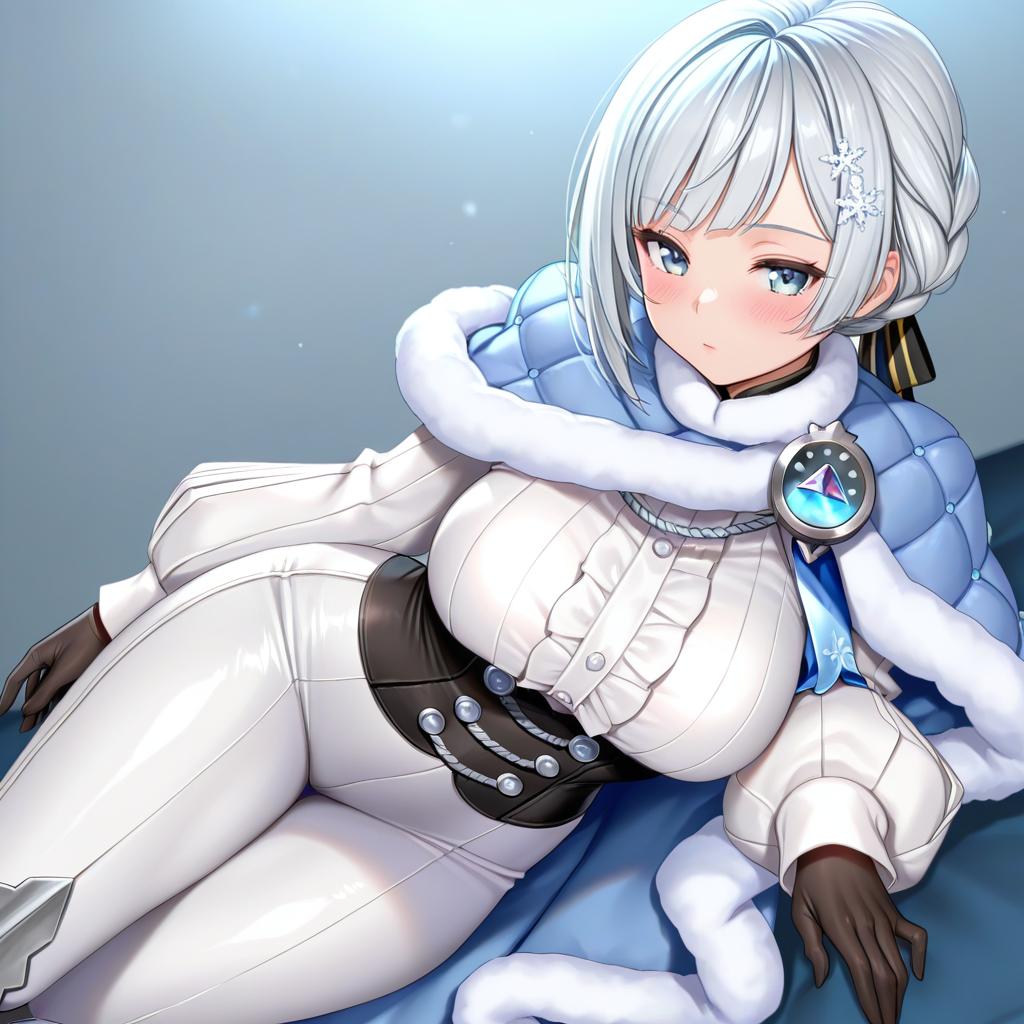 Akershus fortress (oshiro project), oshiro project:re, 1girl, blue eyes, grey hair, short hair, braid, hair ornament, breasts, thighs, blue cloak, tight clothes, fur-trimmed cape, blue cape, black gloves, white shirt, fur-trimmed cloak, white bodysuit, padded cloak, tight clothes, frilled shirt, center frills, long sleeves, puffy long sleeves, badge, black corset, by artist masami chie, illustrious
