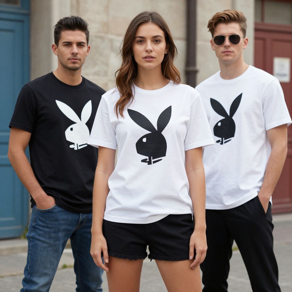 Photograph of three young adults standing outdoors. The central woman with long brown hair, wearing a white t-shirt with a black Playboy bunny logo and black shorts, stands confidently. Flanking her are two men in similar white t-shirts with the same logo, one in black pants and sunglasses, the other in blue jeans and dark hair. The background includes a stone building with blue and red doors. The overall style is casual and modern, with a focus on the iconic Playboy logo.