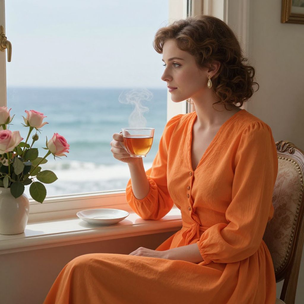 Amidst the timeless allure of vintage elegance, a woman in vibrant orange sits by the window, her hand poised over a steaming cup of tea, as the ocean's rhythmic whispers and the soft scent of roses intertwine with her contemplative gaze, evoking a serene yet introspective moment of connection with the enduring beauty of life.
