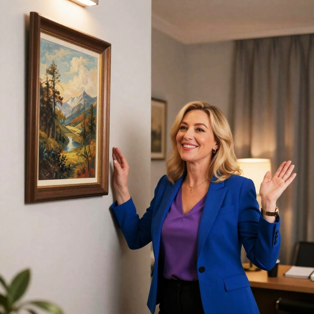 A middle-aged woman with shoulder-length blonde hair wearing a blue blazer and purple top stands smiling in a room with hands raised. She is beside a beige wall with a framed landscape painting of mountains and trees. The background includes a desk, lamp, curtains, and another framed picture.